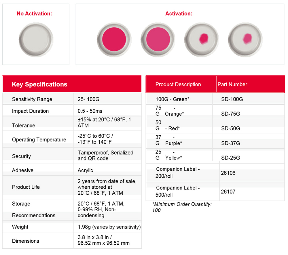 Any red in the white area of the ShockDot indicator window alerts receivers to inspect the package for potential damage.